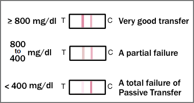 By examining the line intensities one can determine the need for supplementation. When test line intensity is much greater than control line intensity, this indicates a very good transfer (> 800 mg/dl). When the test and control lines have similar intensities, this indicates a partial failure (800 to 400 mg/dl). A weak test line compared to the control line indicates a total failure (400 mg/dl).