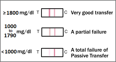 By examining the line intensities one can determine the need for supplementation. When test line intensity is much greater than control line intensity, this indicates a very good transfer (≥ 1800 mg/dl). When the test and control lines have similar intensities, this indicates a partial failure (1000 to 1790 mg/dl). A weak test line compared to the control line indicates a total failure (1000 mg/dl).